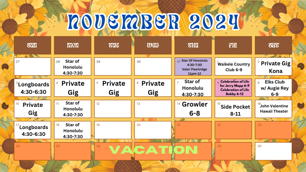 November Calendar 30 Wednesday Oct 2024 Posted by jeannettetrevias in Uncategorized ≈ Leave a comment