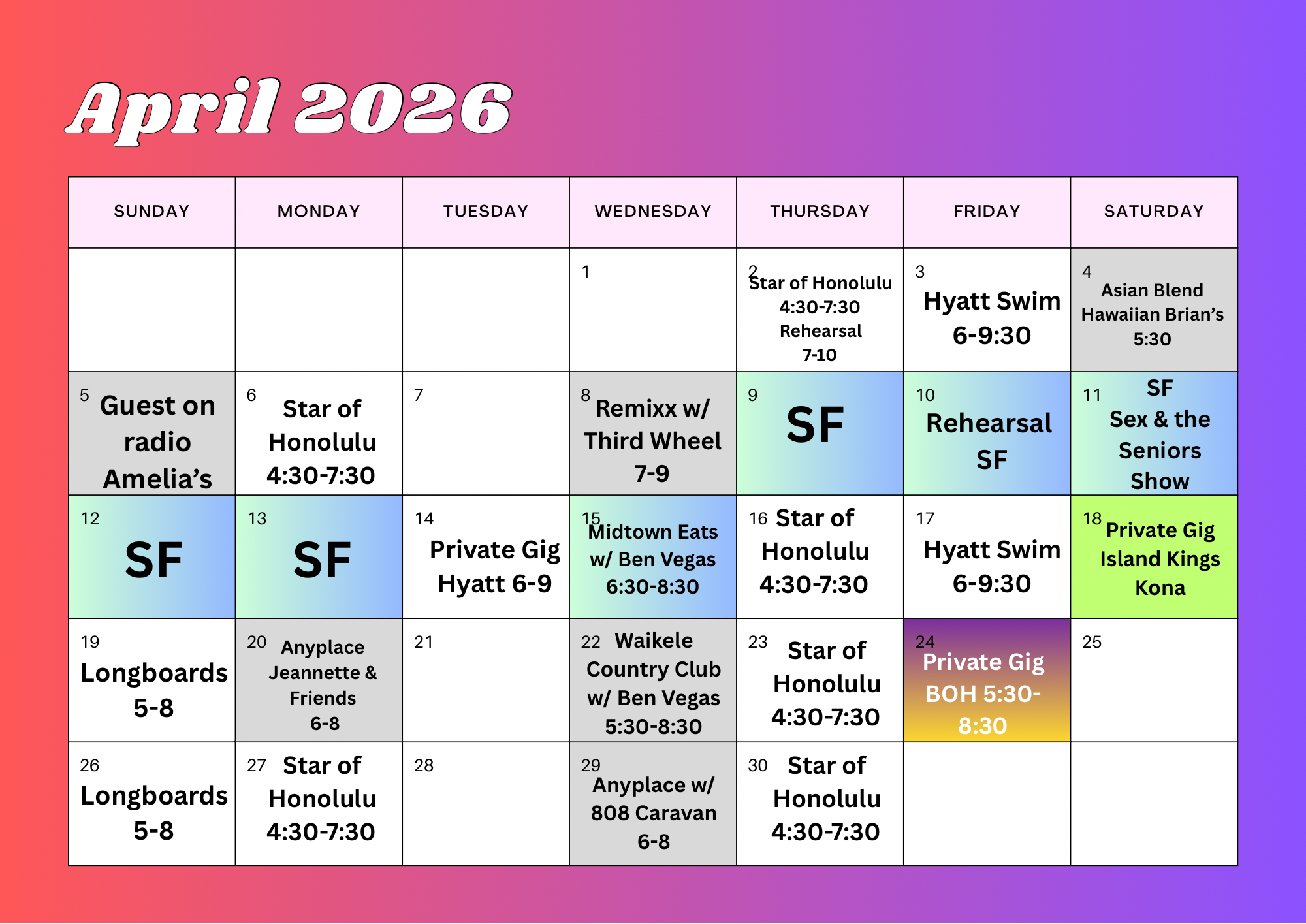 April Gig Calendar 10 Friday Apr 2026 Posted by jeannettetrevias in Uncategorized ≈ Leave a comment April Calendar Share this: Share on X (Opens in new window) X Share on Facebook (Opens in new window) Facebook Like Loading...